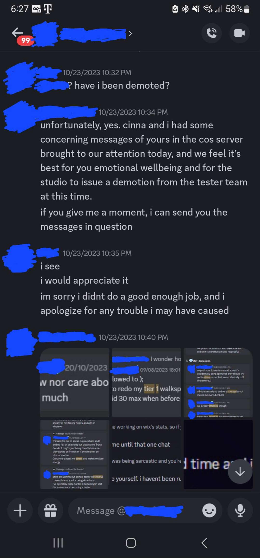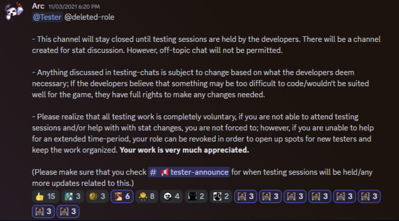 EDIT: Another thing I have come to realize in the later days is that the case of my demotion was very misproperly handled, in that I had received zero warning or initial dm, only the immediate demotion. In the case of a demotion, the user is supposed to be messaged immediately, yet I had to contact one of my supervisors. Not only this, but as previously established the cause of my demotion was my poor mental health and how it was visibly effecting my behavior, so by leaving me panicked and confused in such a way, they had made it even worse and caused even more pain. I had been in such a panic that I had dmed both a tester friend of mine (who is NOT associated with the document, please any who are looking into the carrd do not go after this person, they are innocent) as well as modmail before realizing I should dm one of the people in charge of testers. Once doing so I was informed of my demotion, but I did not receive any apology or even told that they made a mistake on their end. I went about my life thinking they did that intentionally, and spent my time leading up to the creation of the doc full of hurt. The creation of this document, and reaching out and connecting with other ex volunteers who were done wrong, has helped me finally realize and understand these emotions rather than letting them eat away at me inside and continue to hurt me. I hope that the system can improve, because my friends on the team deserve to be happy and volunteer because they love this game, and not because they are threatened with demotion if they falter.